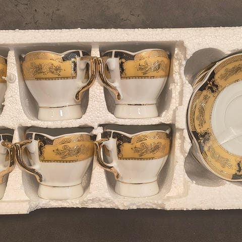 flot sæt kaffekobber og kande med fad