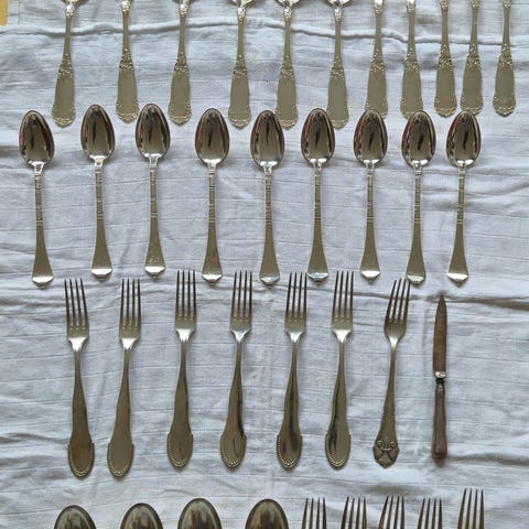 Bestik sæt i sølv plet. Sættet består af forskellige dele, er egnet til daglig brug ved spisebordet eller som ekstra sæt til gæster. Der ses stempler på skaftet, som angiver producent eller materiale. Ialt 33 dele.