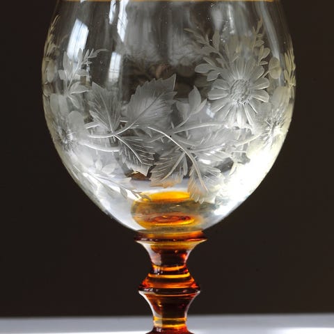 Francesco Toso Borella vinglas med flot emaljemaling. Almindelige små brugsspor. Ingen skår eller revner. Højde 13,7 cm. og diam. 10,8 cm.