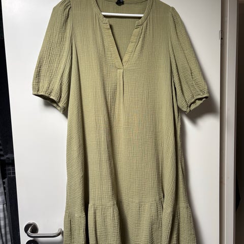 mbyM hverdagskjole. Den er mintgrøn med små hvide blomster. Modellen har kort ærme, rund hals og skjult knaplukning foran ved brystet. Skørtet er skåret i flere lag med let rynkeeffekt for et løst og behageligt fald. Egnet som hverdagskjole.