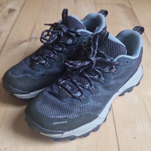 Vibram sommer vandre-sko, str. 40. Ser ud som ny, pånær skoen må have fået rigelig varme på et tidspunkt, da der er trængt noget lim ud, som ses på hælene. Blot kosmetisk. Har ikke funktionel betydning. Men skoen sælges derfor billigt.