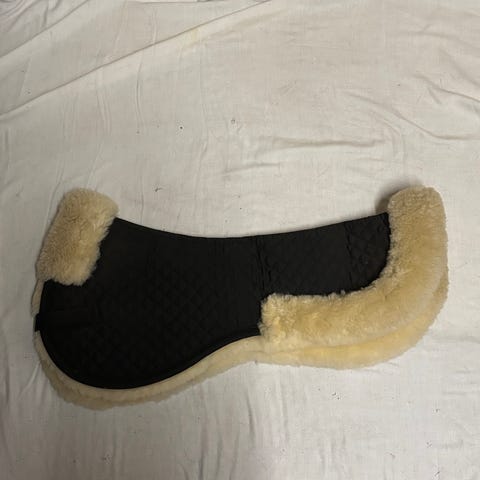 HKM Sports Equipment lammeskindspad til sadel i sort med hvidt lammeskind. Padden har quiltet overside og blød lammeskindsunderside, som ligger mellem sadel og hest. Udstyret med stropper til fastgørelse ved sadlen. Velegnet som ekstra polstring og trykfordeling under sadler. Str. Xl / totallængde med lam over ryggen 56 cm.