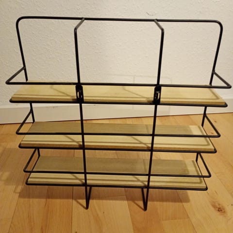 Fremstår pæn og klar til brug. Mangler én lille skrue i den ene hylde, se billede.