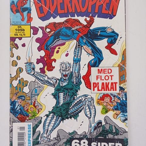 Edderkoppen tegneseriehæfte på dansk med forsideillustration af superhelten Edderkoppen i aktion. Hæftet indeholder en plakat, som angivet på forsiden. Bagsiden viser en trykt reklame. Velegnet til samlere af danske superhelte-tegneserier og fans af Edderkoppen-universet.
