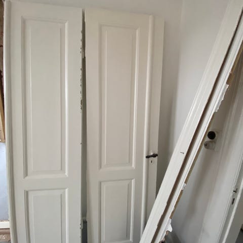 Flot dobbelt fyldningsdør i hvidmalet træ. Døren består af to sidehængte dørfløje med klassiske fyldninger og dybe profiler. Egnet til indvendig brug, f.eks. som rumadskillelse eller til indbygget skab. Overfladen fremstår malet og kan efter behov males om eller tilpasses eksisterende karm og beslag. Døren fremstår i god stand.