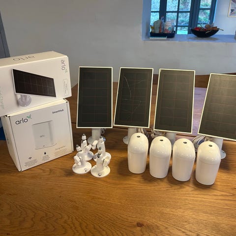 2 Arlo kvalitets overvågningskameraer sælges. Der medfølger vægophæng og usb oplader kabel.