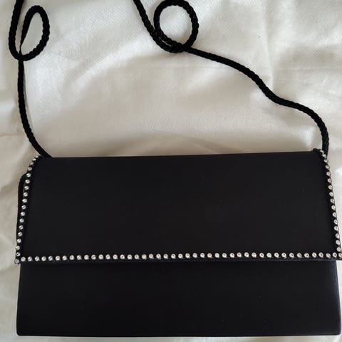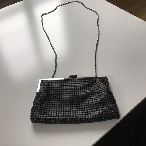 Tasken er aflang med kort hank, så den kan bæres i hånden eller over underarmen. Ydersiden er sort med et mønster af små lyse firkanter. Tasken lukkes med lynlås foroven. Indvendigt har den et enkelt hovedrum med glat foer og lille mærke med Mango-logo. Det har et dekorativt mønster med små detaljer, som giver et elegant og lidt festligt look. Velegnet til at have de vigtigste småting med.