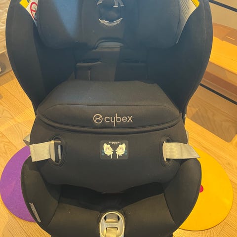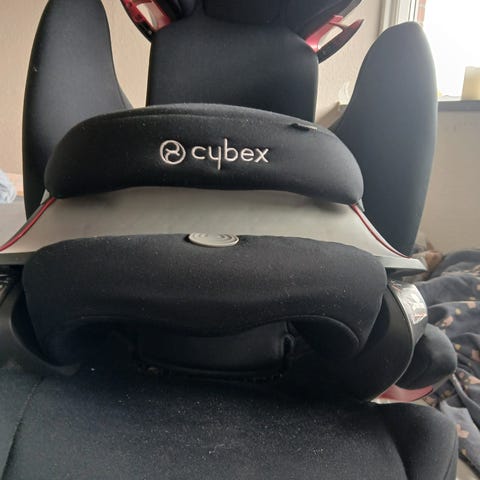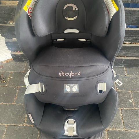 Cybex autostol str. 36 i sort. Autostolen er udstyret med base og støtteben, som ses på billederne. Selen spændes med frontspænde, og der er visuelle anvisninger på siden af basen for korrekt montering. Stoffet er mørkt og helfarvet, og betrækket kan lynes af på bagsiden.