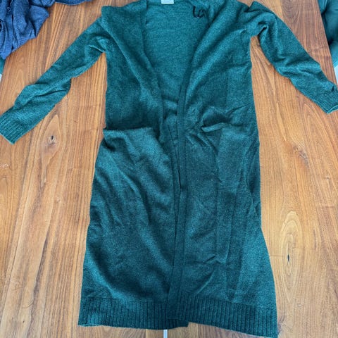 Brugt men stadig god og varm lang cardigan str. ca. S. Har lommer. Garnet er Allewetta fra Filcolana, overvejende uld og lidt polyester. En del bruger denne model ifm graviditet.