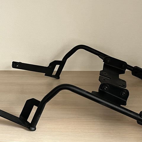 Motorcykel sidetaskeholder i metal i sort farve. Holderen er beregnet til montering på motorcykel til fastgørelse af sidetaske eller bagage. Velegnet som reservedel eller ekstra holder, hvor der er behov for en stabil og fast montering af taske på siden af motorcyklen. Monteringsbeslag og fæstepunkter fremgår af billedet.