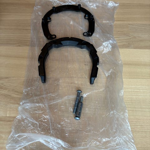 Motorcykel sidetaskeholder i sortlakeret metal. Holderen er trekantet med flere monteringspunkter og er beregnet til montering på motorcykelens side til fastgørelse af sidetaske eller bagage. Velegnet som reservedele eller udskiftning af eksisterende sidetaskeholder, forudsat at mål og beslag passer til den pågældende motorcykelmodel.
