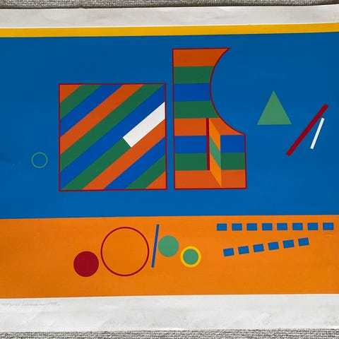 Abstrakt litografi med geometriske former og håndtegnede linjer. Motivet er holdt i overvejende neutrale nuancer som beige, brun og sort med markante felter i rød, hvid og gul.