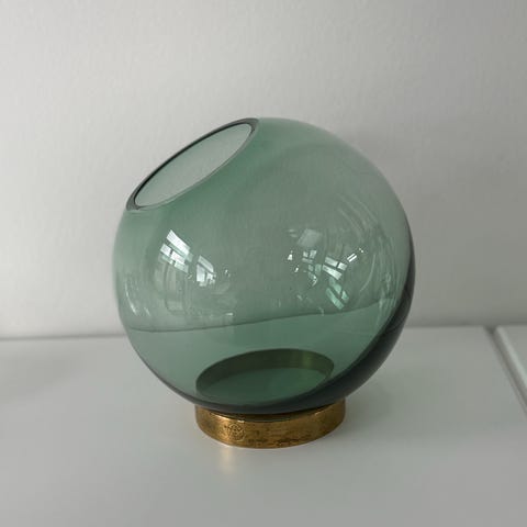 AYTM Globe vase i glas med aftagelig messingfod. Vasen er kugleformet med åbning i toppen og let grønlig glasfarve. Egnet til blomster, grene eller som dekorativt objekt. I original emballage.