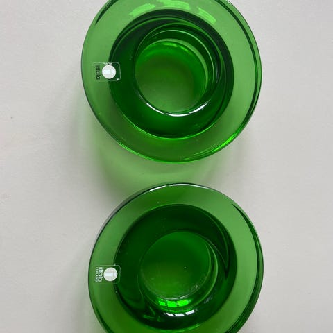 (Antikpris 2 x 350> 2 x 450,- 2 x 475,- ) "Diskos" 1992. Diskosformet lysestage fra serien "Diskos" med hul til lys i midten. Planslebet i bund. Oprindelig etikette fra Royal Copenhagen 1964 ?https://www.glashistoriskselskab.dk/start/index.php/glashistorisk-museum/143-holmegaard-designet-glas/145-holmegaard-designet-glas-per-luetken/201-holmegaard-designet-glas-per-luetken-kunstglas-1984-1997?start=40#&gid=1&pid=1
