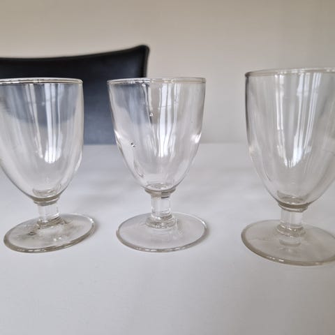 Man kan se lidt luftbobler rundt i glassene og er afvigende i mm i højden, fødderne mv, pga de nok er mundblæste i 1920-1940 periode?