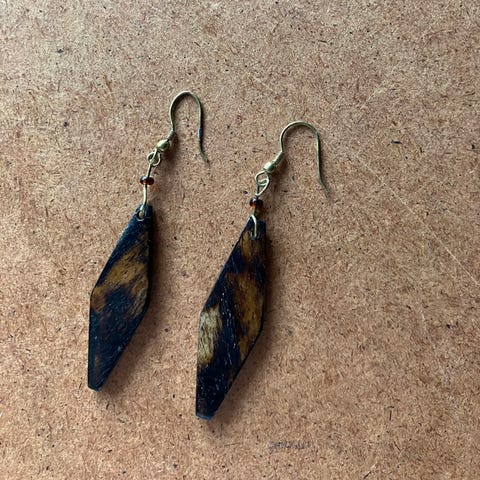 Mørkebrune armringe med lys brun og beige mønster.