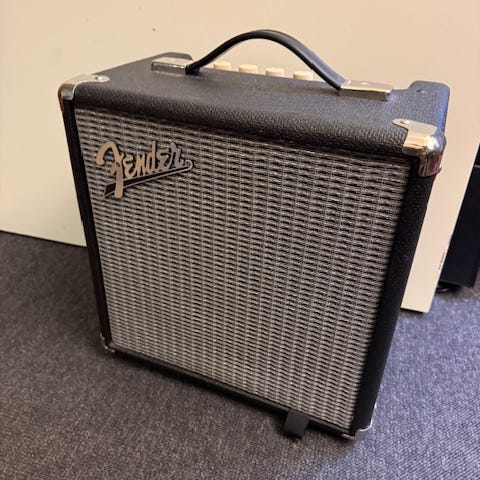 Fender forstærker til bas. Kompakt combo-forstærker med frontgitter i sølv og kabinet i sort finish. Topbetjening med indgang til guitar, volumekontrol, tone- og gain-regulering samt tænd/sluk-knap. Velegnet til øvning derhjemme eller i mindre rum. Tilsluttes via standard strømkabel.