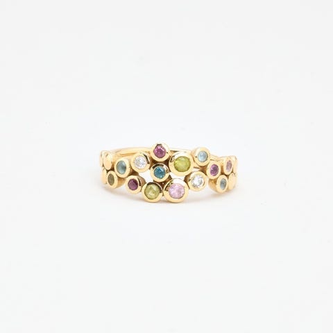 Ringen har indfattede krystaller i forskellige faconer og farver, blandt andet hjerteformede sten.