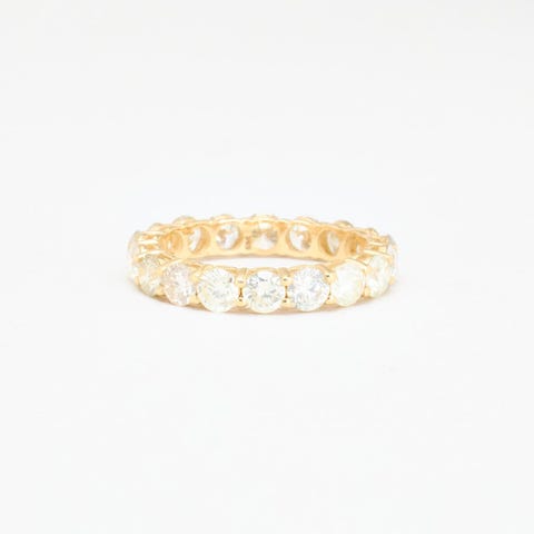 Ringen er unisex og har en helcirkel af rektangulære krystaller i en rosa/pink nuance, indfattet i en forgyldt ring.