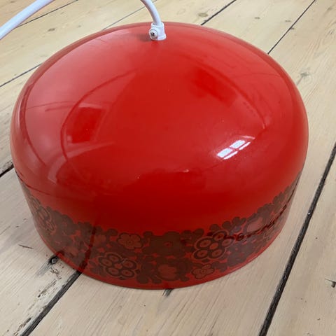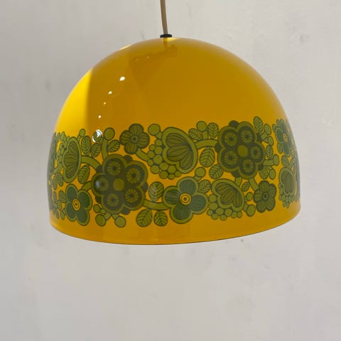 Denne lille vintage pendel er designet af den finske formgiver Kaj Franck og produceret af Fog & Mørup i samarbejde med Arabia omkring 1970. Lampen er fremstillet i emaljeret metal med en varm gul finish og dekorative brune blomster, som giver et poetisk og farverigt udtryk. Den hvide inderside sikrer en behagelig lys refleksion, og den kompakte størrelse gør den ideel til mindre rum, hjørner eller som del af en lampegruppe.