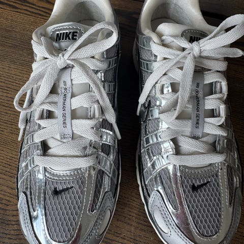 Nike sneakers P6000 i str. 40. Synes dog ikke størrelsen er stor så passer også en 39. Modellen er i sort og lilla med hvid mellemsål og sort ydersål. Overdelen er i mesh og syntetisk materiale med snørelukning. Skoene egner sig til hverdagsbrug og let træning. Ydersålen har mønster, der giver godt fodfæste.