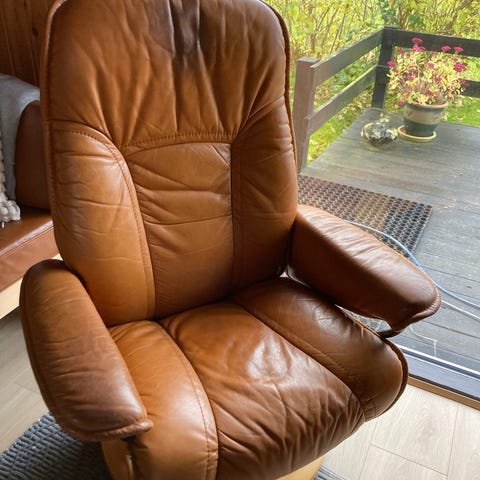 Klassisk norsk kvalitet med 360° sving, Stressless glide-system og recliner-funktion. Læderet er blødt og uden huller/revner.