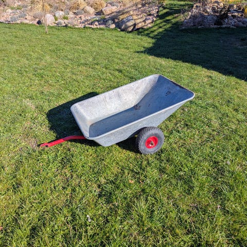 Randersbøren fodervogn i stål med blå lakeret beholder. Modellen har tre hjul med massiv gummibereifning og kraftigt håndtag i stål. Velegnet til transport af materialer i have, landbrug eller værksted. Beholderen er rektangulær og rummelig, og konstruktionen er udført i kraftigt stål til tungere læs.