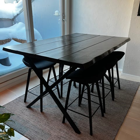 Meget velholdt spisebord med sort marmorplade og egetræsstel. Der medfølger 4 skovby spisebordsstole i egetræ.