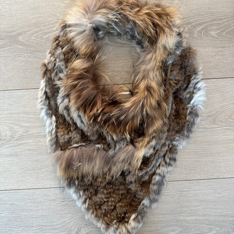 Pels / tørklæde / krave Str. 105 cm lang og 14 cm bred i kaninpels . Farve brunt One size. Foret, og med flere indstillinger så det ligger pænt om halsen. Kan også bruges som krave til jakke, frakke eller kjole.