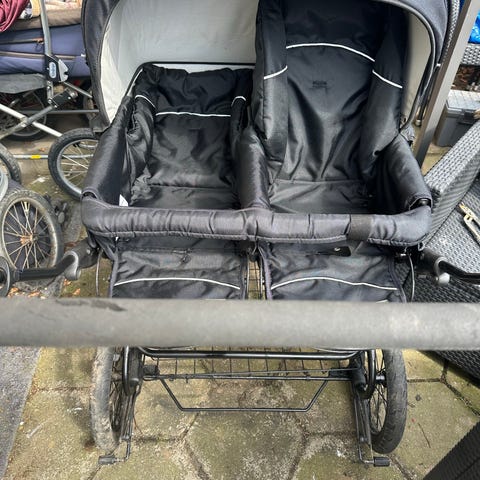 God, men brugt. Har stået i varm kælder de seneste år. Er vist her med baby-sæde, som følger med. Den kommer med de to oprindelige sæder. Med følger originalt regnslag til dobbeltvogn