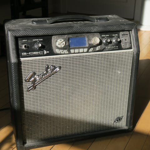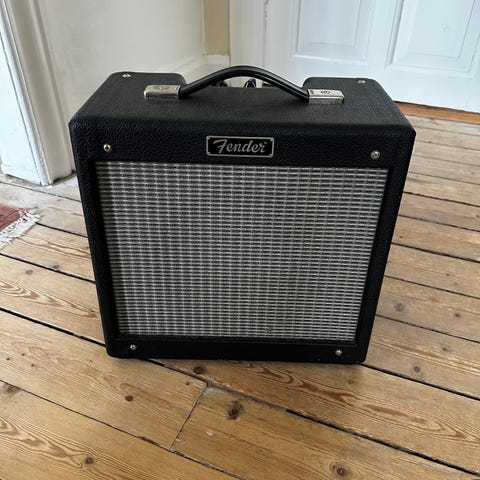 Fender G-DEC Junior guitarforstærker. Kompakt forstærker til elguitar med indbyggede kontroller for volumen, gain, tone og effekter. Topbetjeningspanelet giver adgang til flere justeringsmuligheder, herunder forskellige lydindstillinger og niveaukontrol. Velegnet til øvebrug i hjemmet eller mindre rum, hvor der er behov for en enkel og transportabel løsning til guitarspil.
