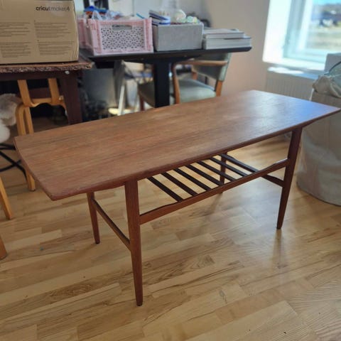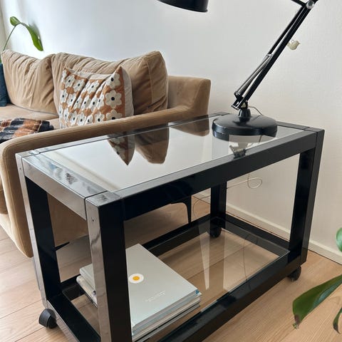 Et meget fint gammel bord med hjul. Brugt som sofabord. Der er diverse skrammer og ridser. Ikke forsøgt repareret. Har mange gode stunder i sig, men sælges da det er upraktisk med børn.