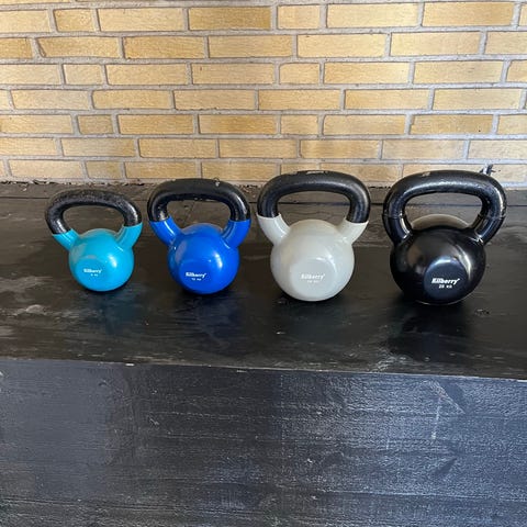 Kettlebell på 8 kg i grå og orange. Egnet til styrketræning, funktionel træning og øvelser som sving, squat og pres. Formen med håndtag gør den velegnet til både hjemmebrug og træningscenter.