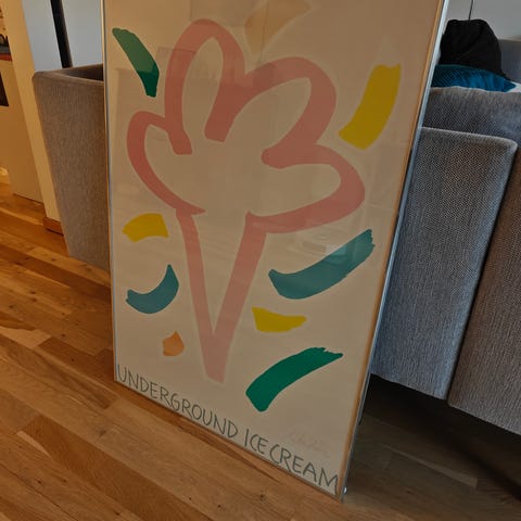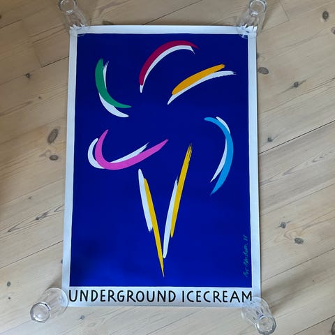 Retro plakat, Bo Bendixen, motiv: Underground Ice Cream, b: 67 h: 97, Original indrammet butiksplakat fra Underground Ice Cream, tegnet af grafikeren Bo Bendixen.