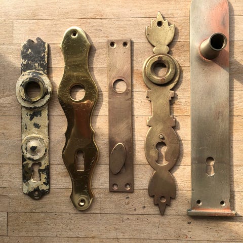 dørhåndtag i klassisk stil med greb i lyst træ og beslag i messingfarvet metal. Sættet omfatter flere sæt dørgreb samt runde nøgleskilte i samme messingfarvede finish. Velegnet til indvendige døre, hvor der ønskes et kombineret udtryk af metal og træ. Designet med drejet træhåndtag og afrundede ender på grebet.