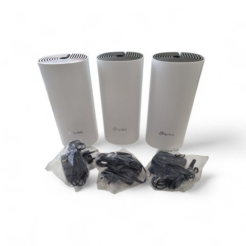 TP-Link m4 Deco router i hvid. Sættet består af to cylindriske enheder med sort top samt tilhørende strømforsyninger og installationsvejledning. Routerne er beregnet til trådløst netværk i hjem eller mindre kontorer og kan typisk bruges som mesh-system til at dække flere rum eller etagearealer med wifi. Enhederne tilsluttes via netværkskabel til modem eller eksisterende netværk og kan administreres via TP-Links app afhængigt af den konkrete Deco-model.