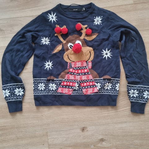 Vero Moda sweater til kvinder i størrelse S. Strikken er i akryl og har sort kant ved hals og kanter med sort/hvidt mønster i resten af trøjen. Modellen har rund hals og 3/4-lange ærmer samt afrundet kant forneden. Velegnet som hverdagsstrik eller let lag over andre overdele.