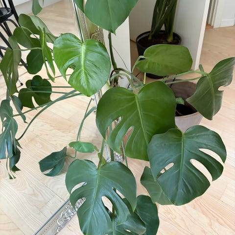 Monstera deliciosa stueplante i grøn med store, fligede blade. Planten står i en lys potte med underskål. Velegnet som indendørs potteplante i stue eller andre opholdsrum, hvor den kan placeres lyst uden direkte, stærk sol. Kræver regelmæssig vanding og mulighed for støtte, efterhånden som den vokser og danner lange stængler.
