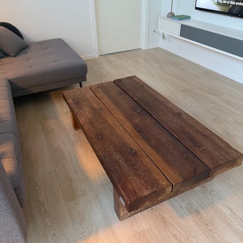Specialdesignet sofabord med glas på hjul.