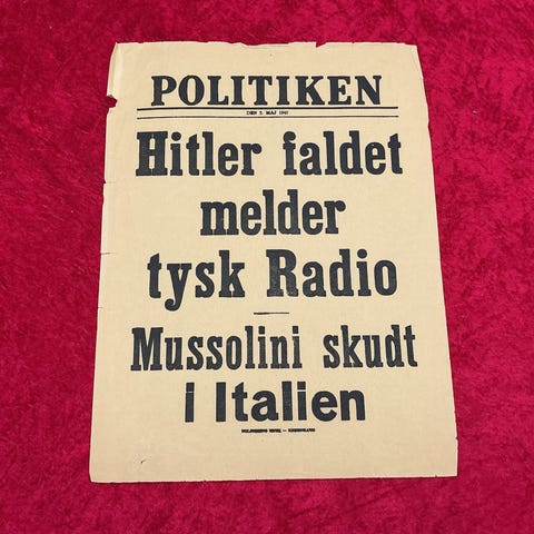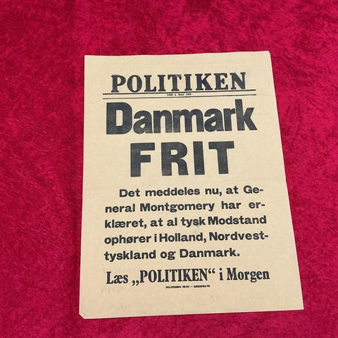 Politiken løbeseddel i form af en historisk avisplakat med overskriften "Tyskland har overgivet sig – Fred i hele Evropa". Trykt tekst på lys baggrund. Egnet som samlerobjekt eller til dekoration med historisk tema.