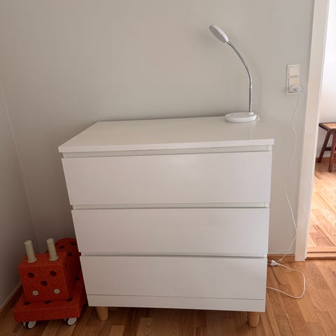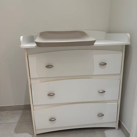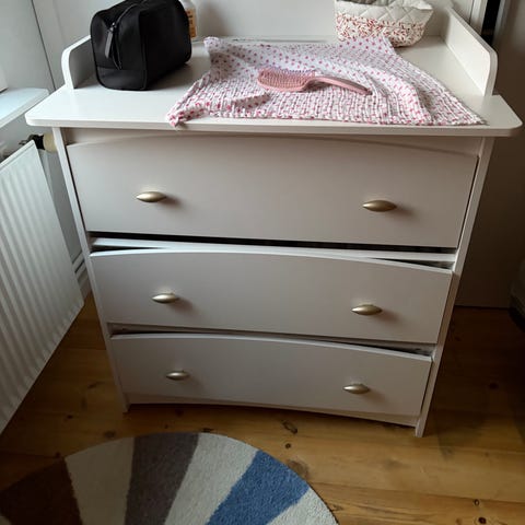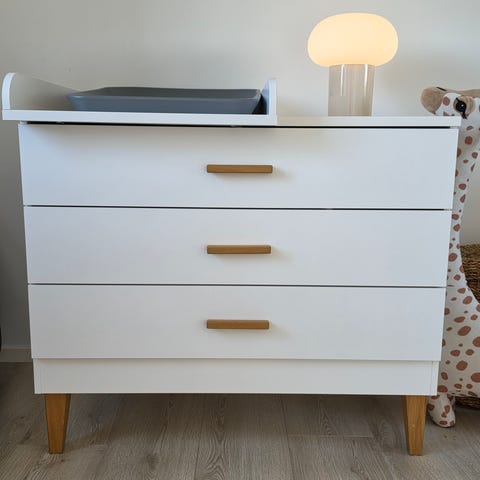 IKEA-kommode med monteret BabySafeBase som pusleplads (skruet fast). Greb med dyremotiver. Kommoden har flere slidmærker, men fungerer fint.