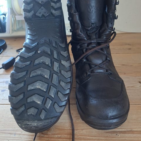 Rigtige herrestøvler, model anvendt af Jægerkorpset. Støvlerne giver solid jordforbindelse under alle forhold. Sælges p.g.a. tvunget til ændret livsstil.
