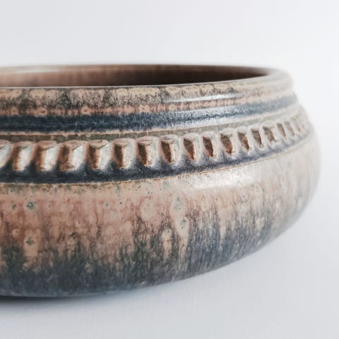 Dybdahl keramikskål i brunlig ler med mørk glasur indvendigt. Skålen er udvendigt dekoreret med reliefornamenterede ansigter/figurer hele vejen rundt, hvilket giver en struktureret overflade. Undersiden er signeret "Dybdahl". Velegnet som dekorationsskål eller til opbevaring af småting.
