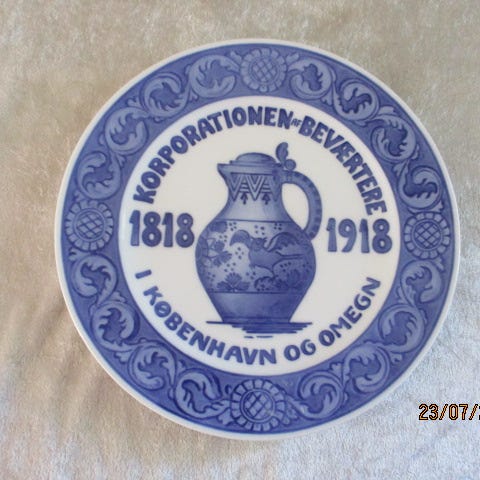 Royal Copenhagen Mindeplatte. fra ODD - FELLOW LOGEN Udgivelsesår: 1918 Oplag: 1570 eksemplarer , diameter: 20,5 cm. Fremstillet i anledning af 4o-års dagen for oprettelsen af den første loge i Danmark.