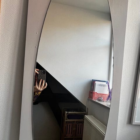 Stort spejl fra Ikea. 78x196cm. Med grå kant. Kan monteres i fodpaneler med medfølgende beslag.