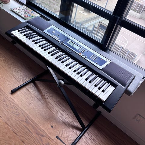 Elektronisk keyboard i sort med tilhørende X-stativ og bænk. På billedet ses også et nodestativ monteret bag på keyboardet samt et sæt hovedtelefoner. Keyboardet har fuldt klaviatur i piano-stil og er egnet til øvning derhjemme, undervisning eller hobbybrug. Sættet kan nemt pakkes sammen og flyttes efter behov💓helt nyt😍