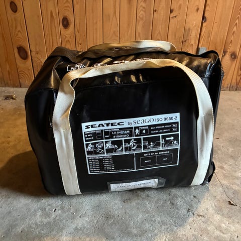 Bombard BIB Offshore 1699950-1 redningsflåde pakket i taske. Tasken er hvid med røde stropper og rødt instruktionspanel på toppen med brugervejledning og sikkerhedspiktogrammer. Redningsflåden er beregnet til brug på vandet som sikkerhedsudstyr om bord på båd eller skib. Alle oplysninger og instruktioner fremgår af panelet på tasken.