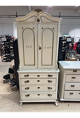 Hvid træstol med flot udskæringer og polstret sæde i mørkeblå farve, perfekt til spisestuen eller i køkkenet.- Bemærk at mail, chat og beskeder ikke besvares, og varen skal købes på knappen "Gå til varen". Efter reservering af varen har du 10 dage til at afhente den i den butik, varen er på lager i.