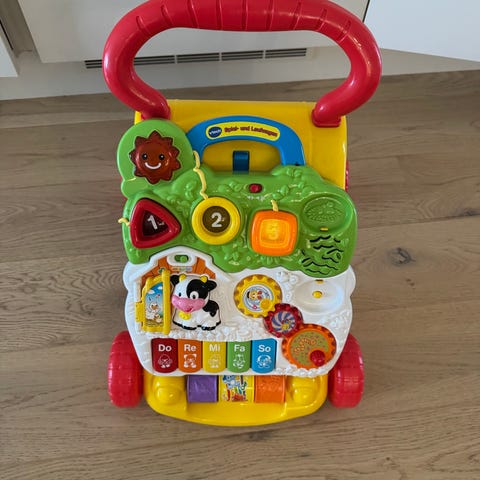 Fisher-Price gåvogn og aktivitetslegetøj til børn i flerfarvet plast. Legetøjet har et sæde og håndtag, så barnet kan skubbe eller sidde og skubbe sig frem. Foran er der en aktivitetsdel med form for kurv og medfølgende bolde, som kan bruges til at kaste eller putte i. Hjulene er brede og stabile, og designet er udformet med farverige figurer og detaljer, der kan stimulere barnets sanser og motorik. Velegnet som støtte til de første skridt og som ride- og aktivitetslegetøj til mindre børn.
