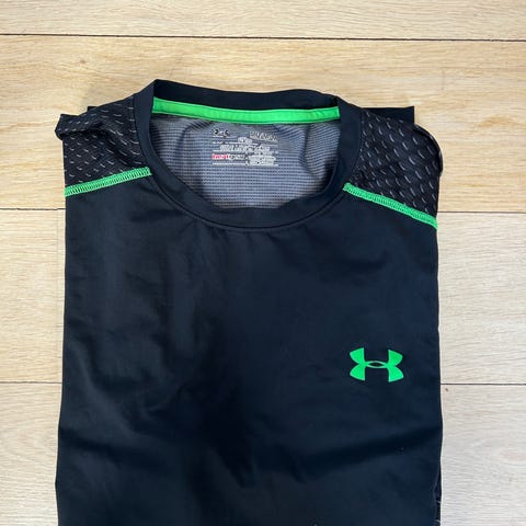 Under Armour træningssæt til herre i størrelse L. Sættet består af træningsjakke med lynlås og matchende bukser. Farven er sort med hvide striber og Under Armour-logo på både jakke og bukser. Egnet til sport og træning eller som afslappet fritidstøj.